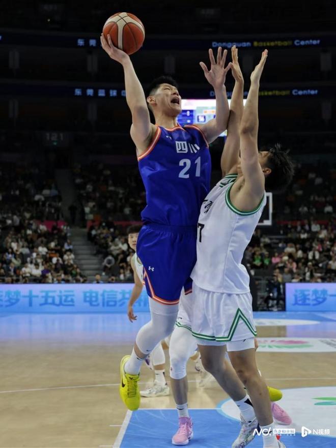 代表四川队出战的周琦在比赛中。上届全运会,他跟辽宁队一起登上了冠军领奖台。